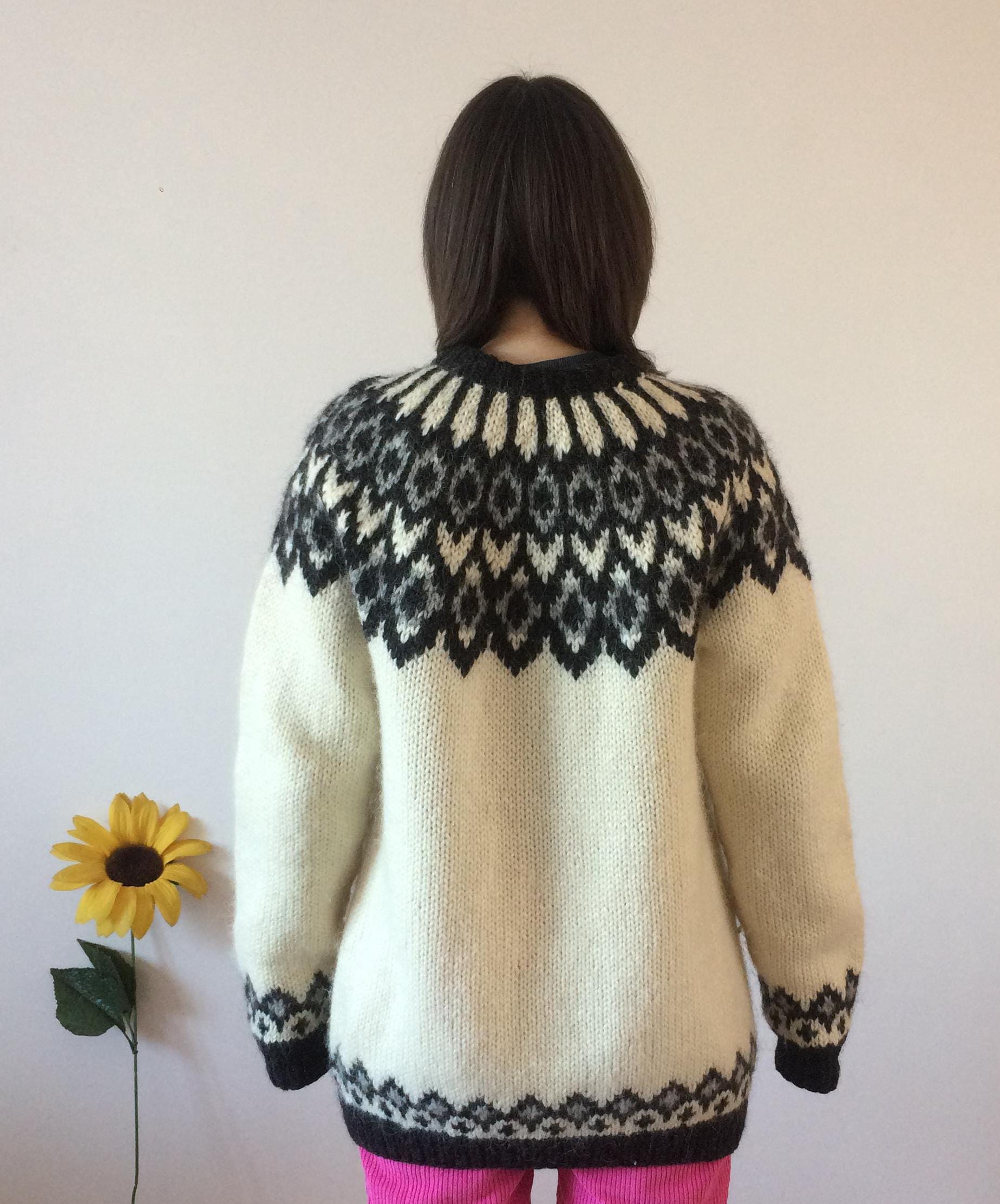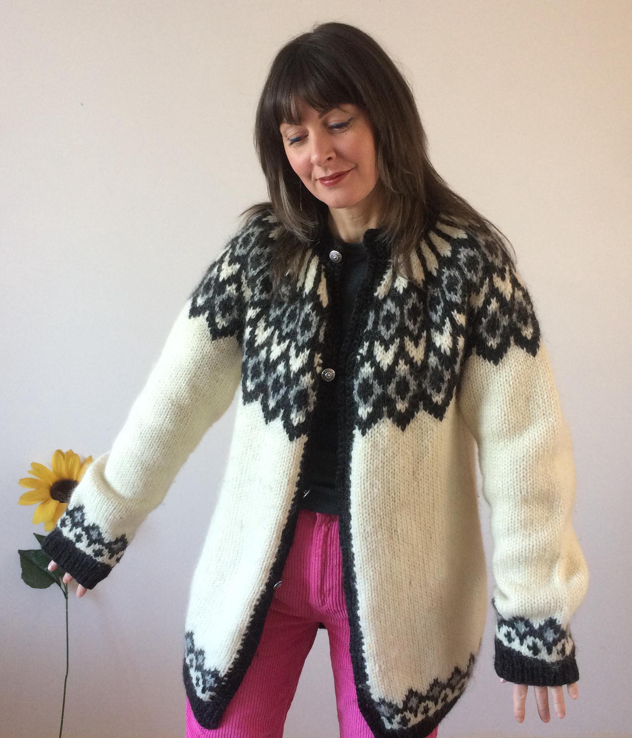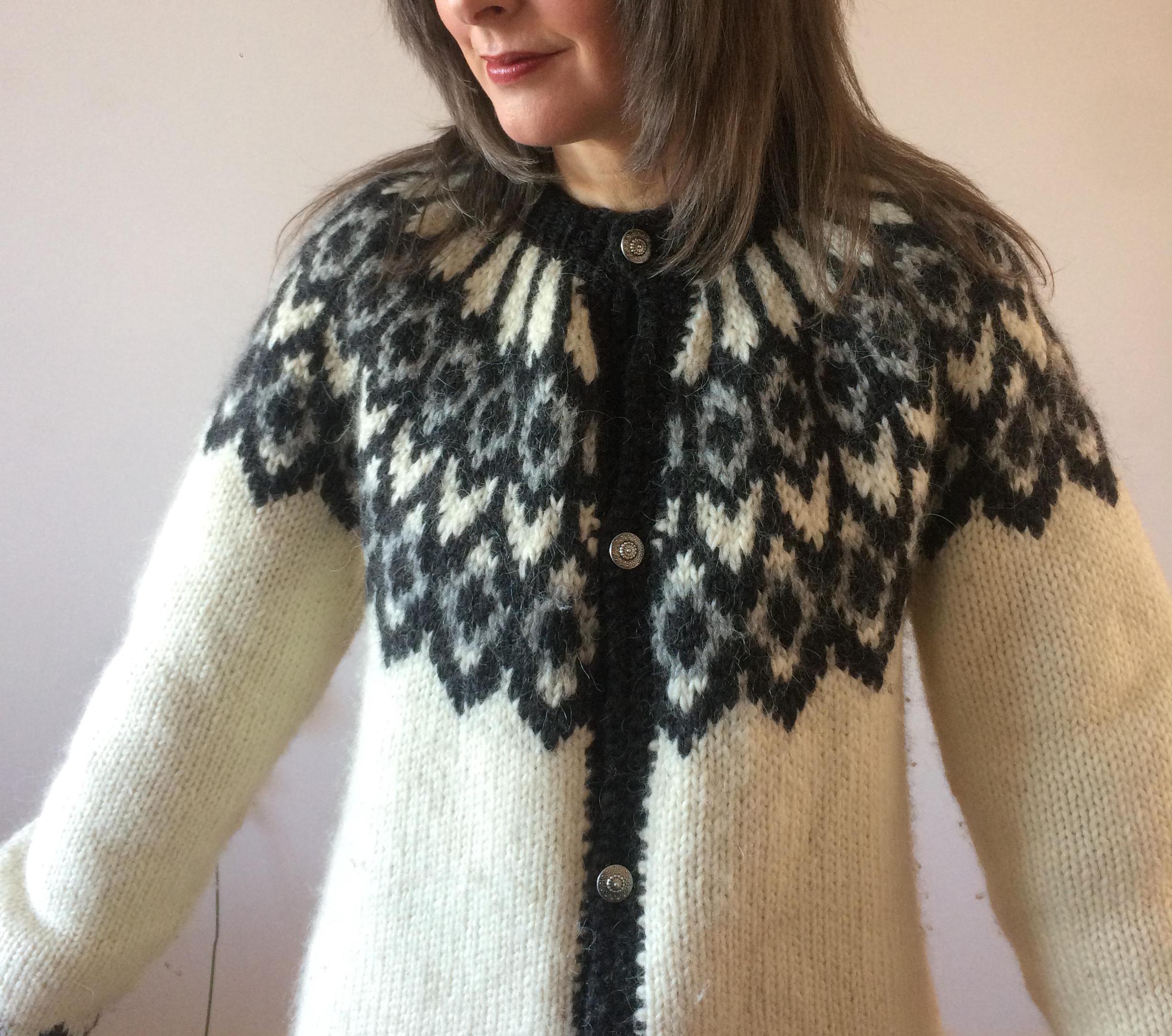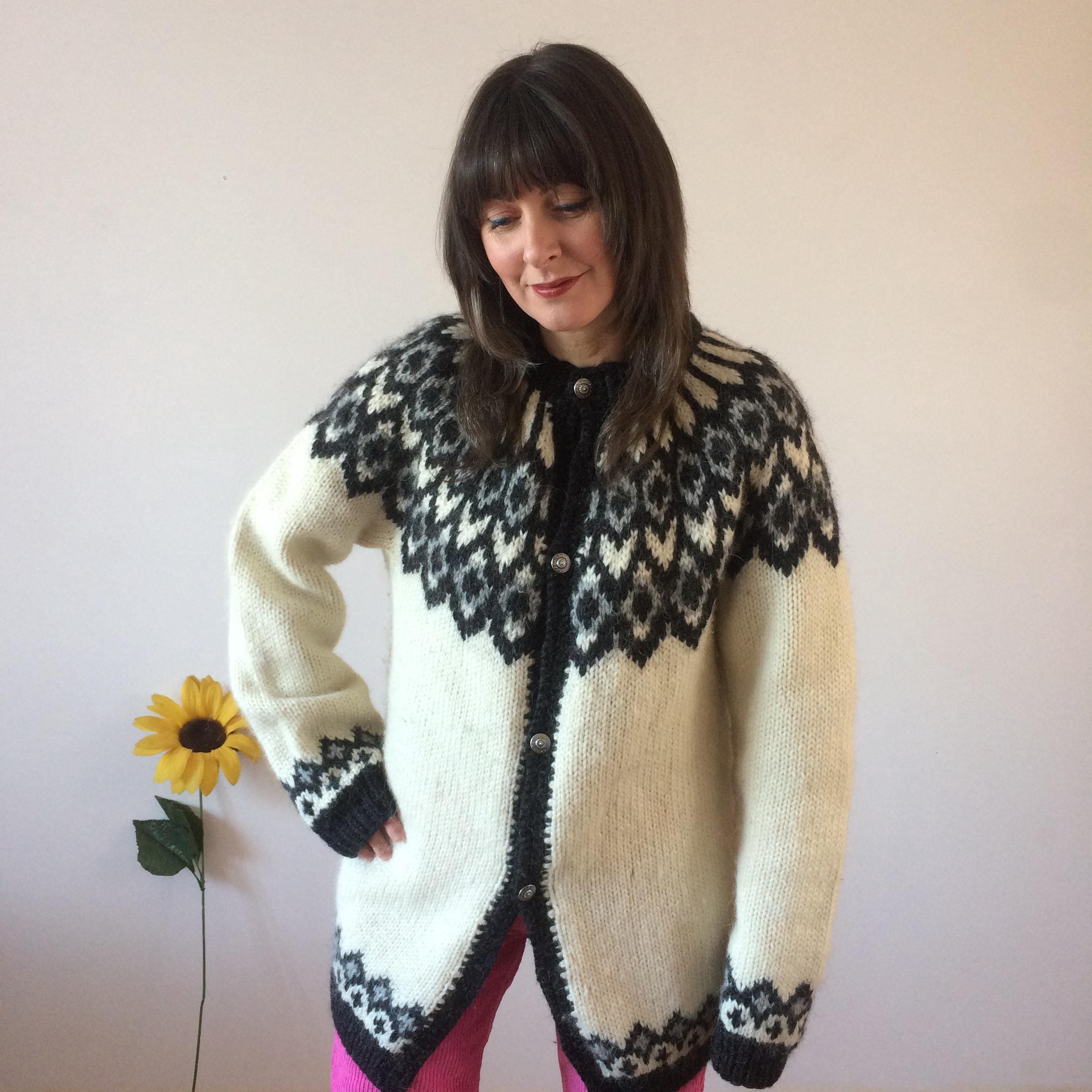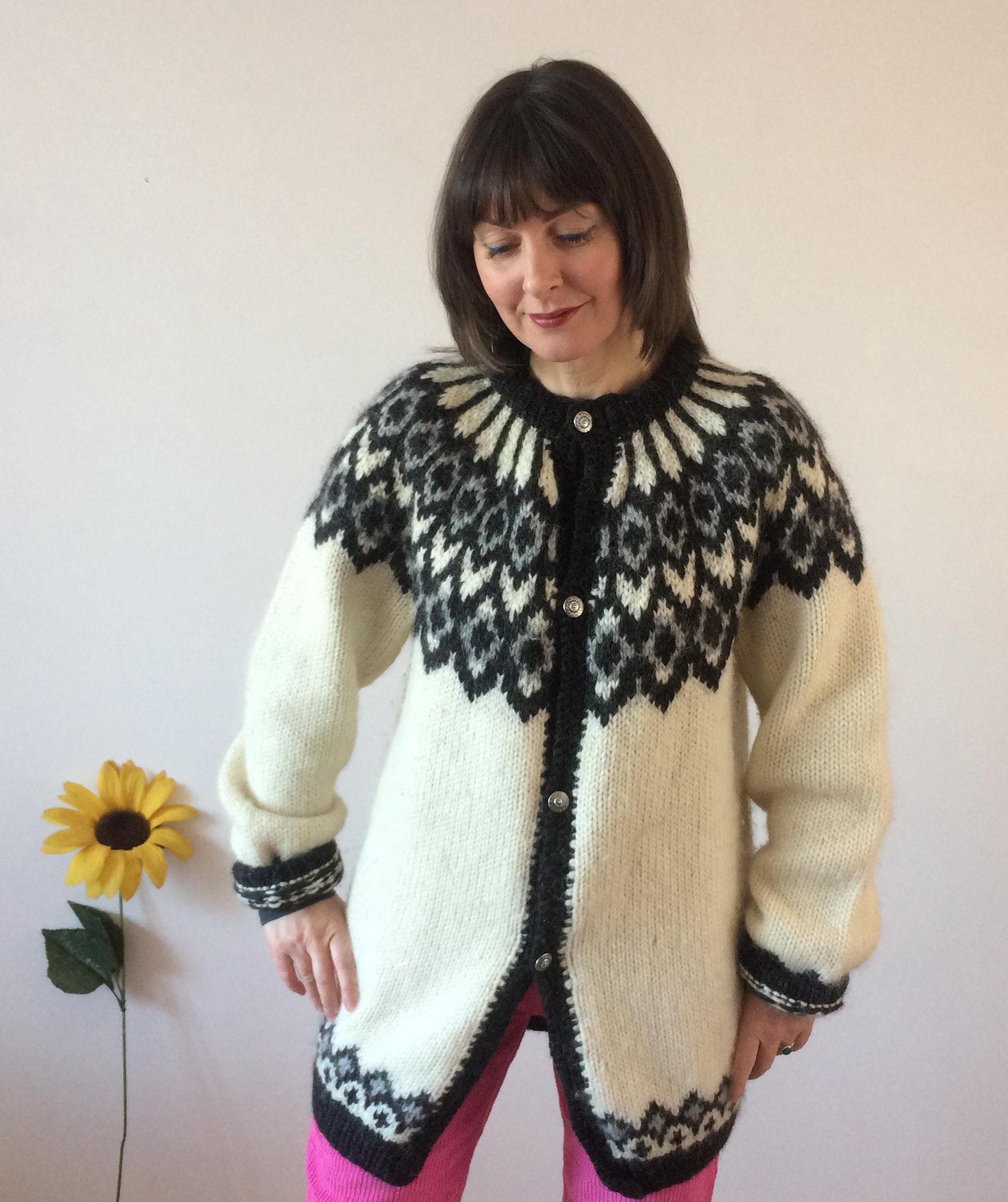 Vintage 70s White and Black Icelandic Knit Cardigan. Size L. Model is a UK size 8 for reference. In great vintage condition. Should you require measurements, photos or product information please get in touch, I'd love to hear from you! Thank you for browsing :) xx