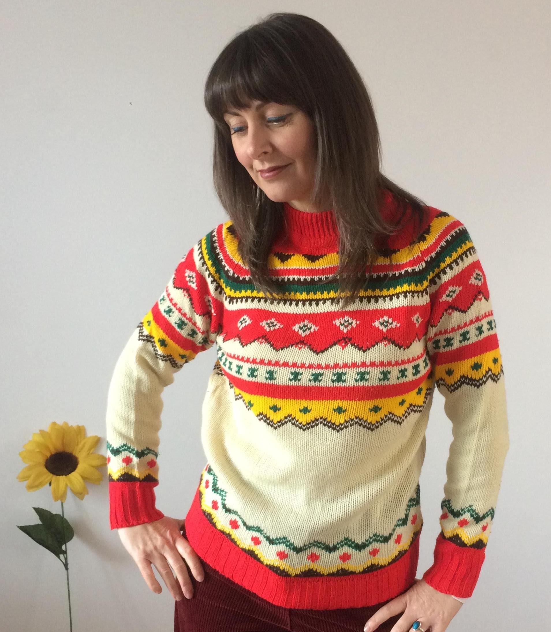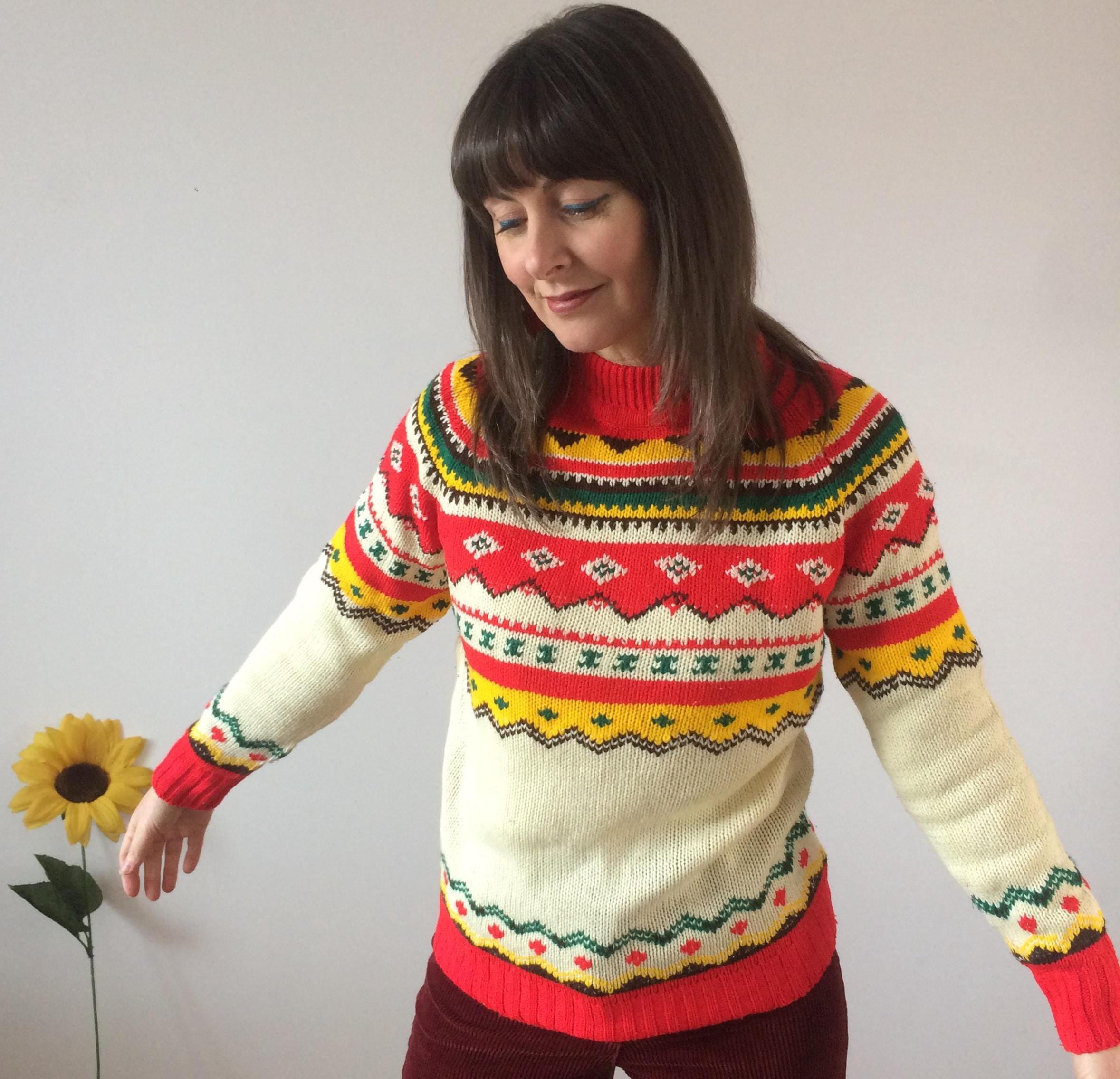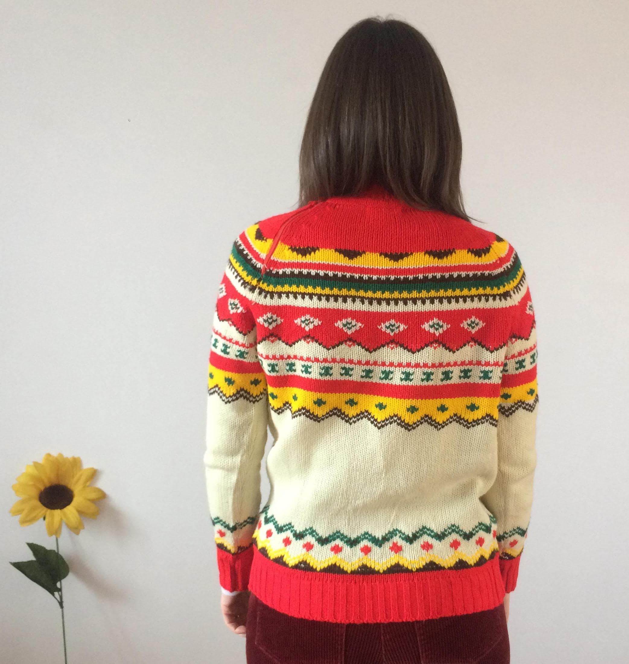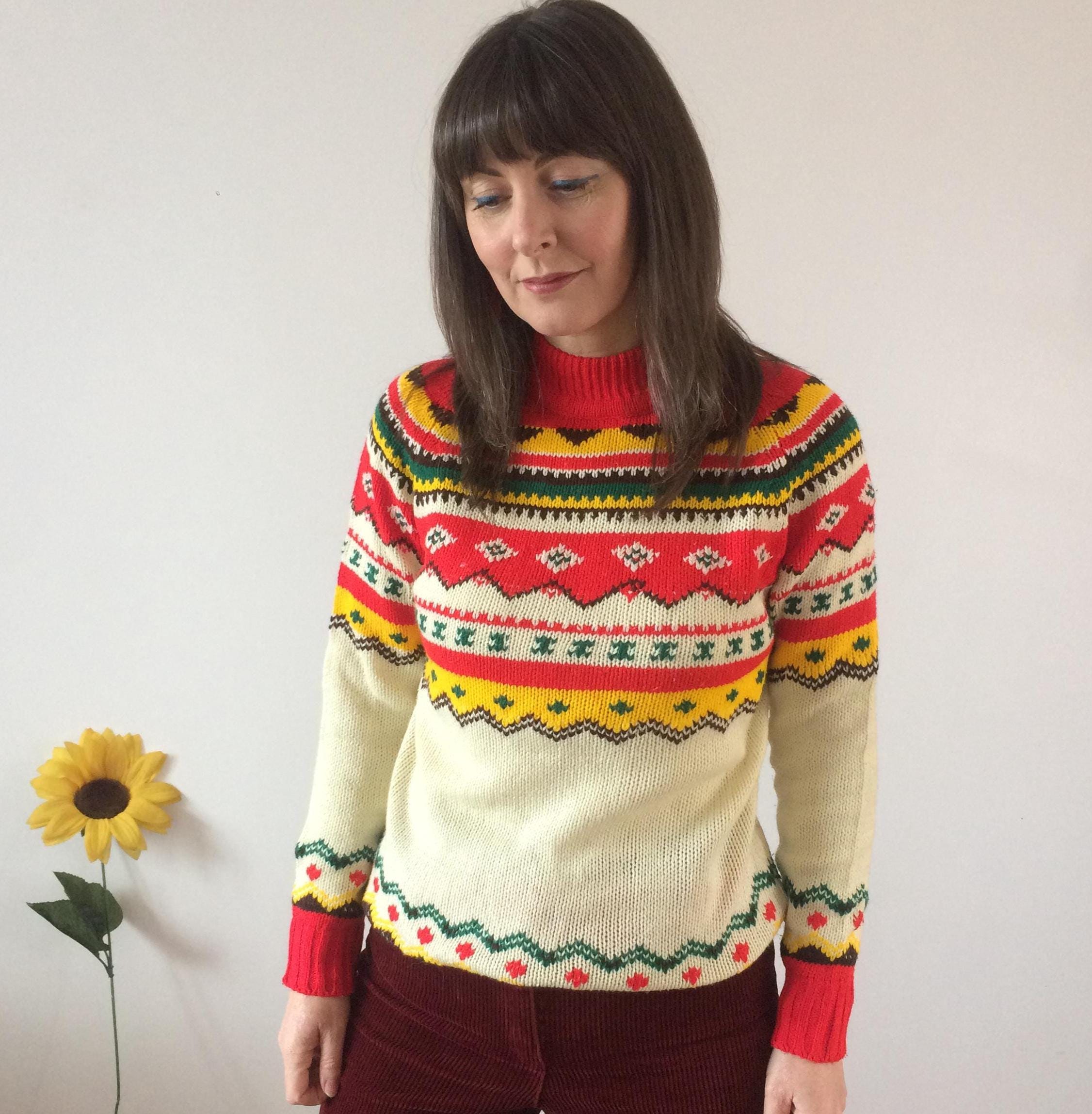 Vintage Red Cream & Yellow Jumper. Size S. Model is a UK size 8 for reference. In great vintage condition. Should you require measurements, photos or product information please get in touch, I'd love to hear from you! Thank you for browsing :) xx
