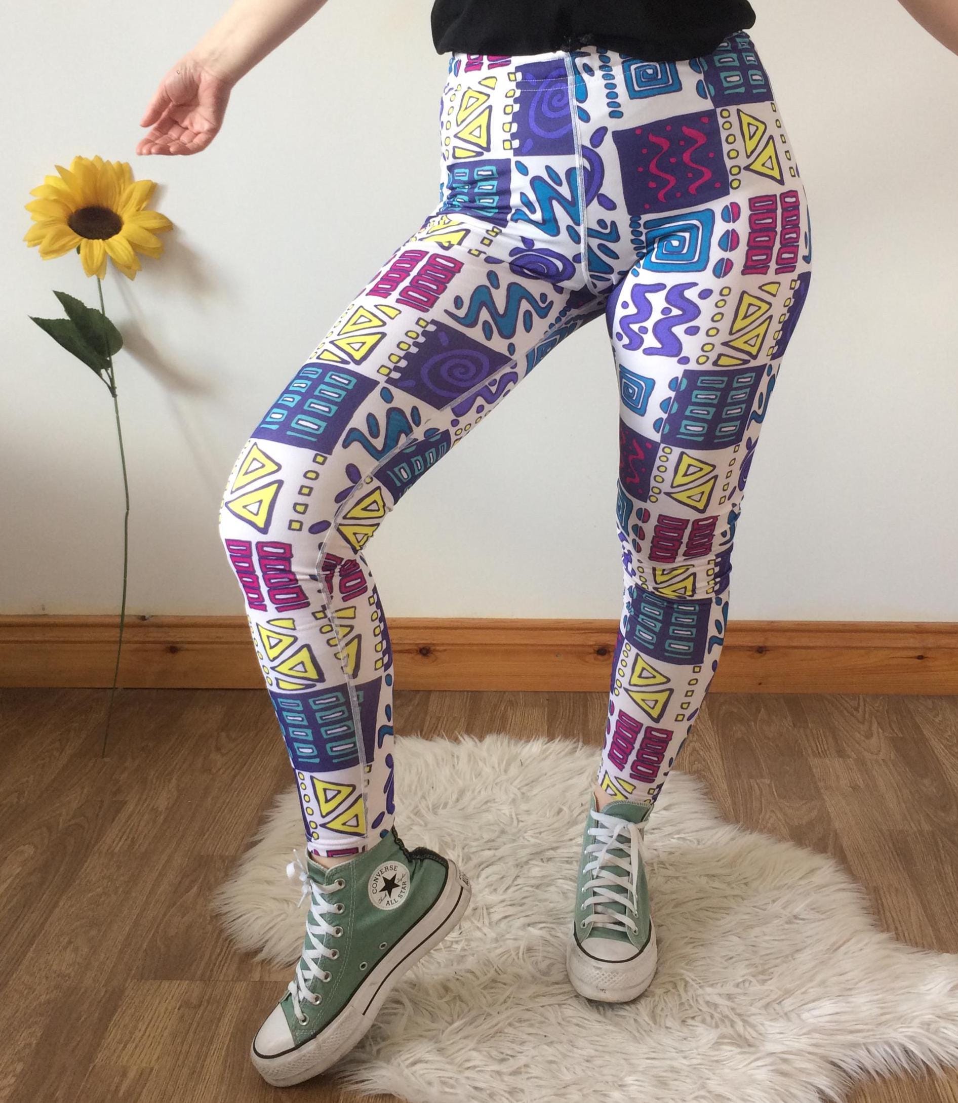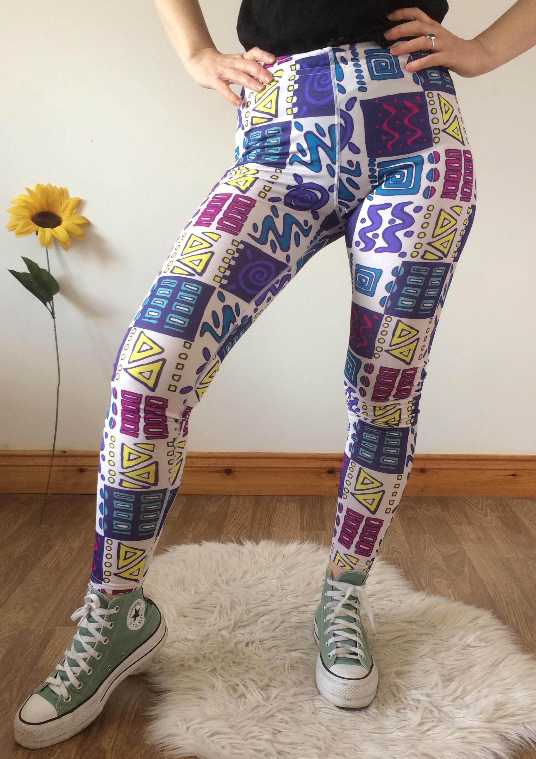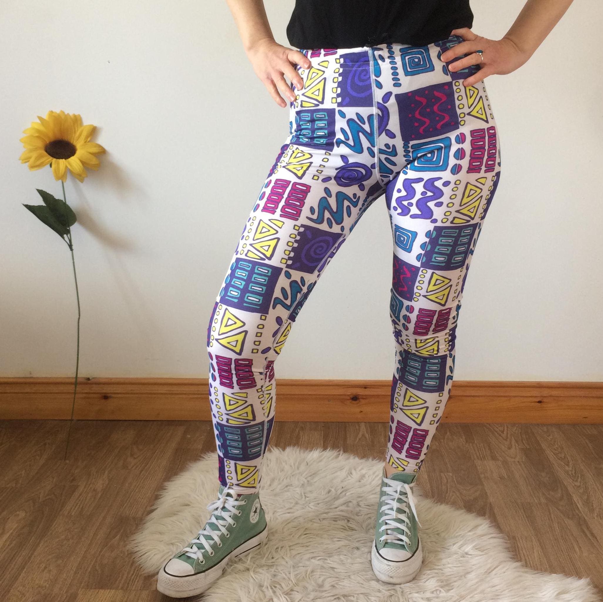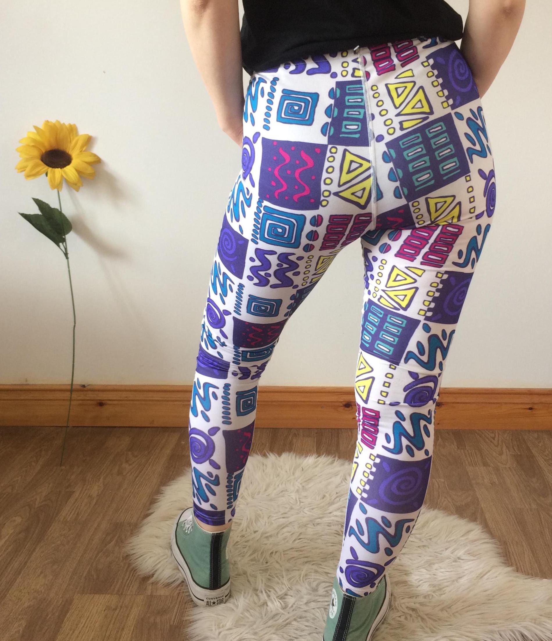 Vintage 90s White Purple Pink & Yellow Leggings. Size S. Model is a UK size 8 for reference. In great vintage condition. Should you require measurements, photos or product information please get in touch, I'd love to hear from you! Thank you for browsing :) xx