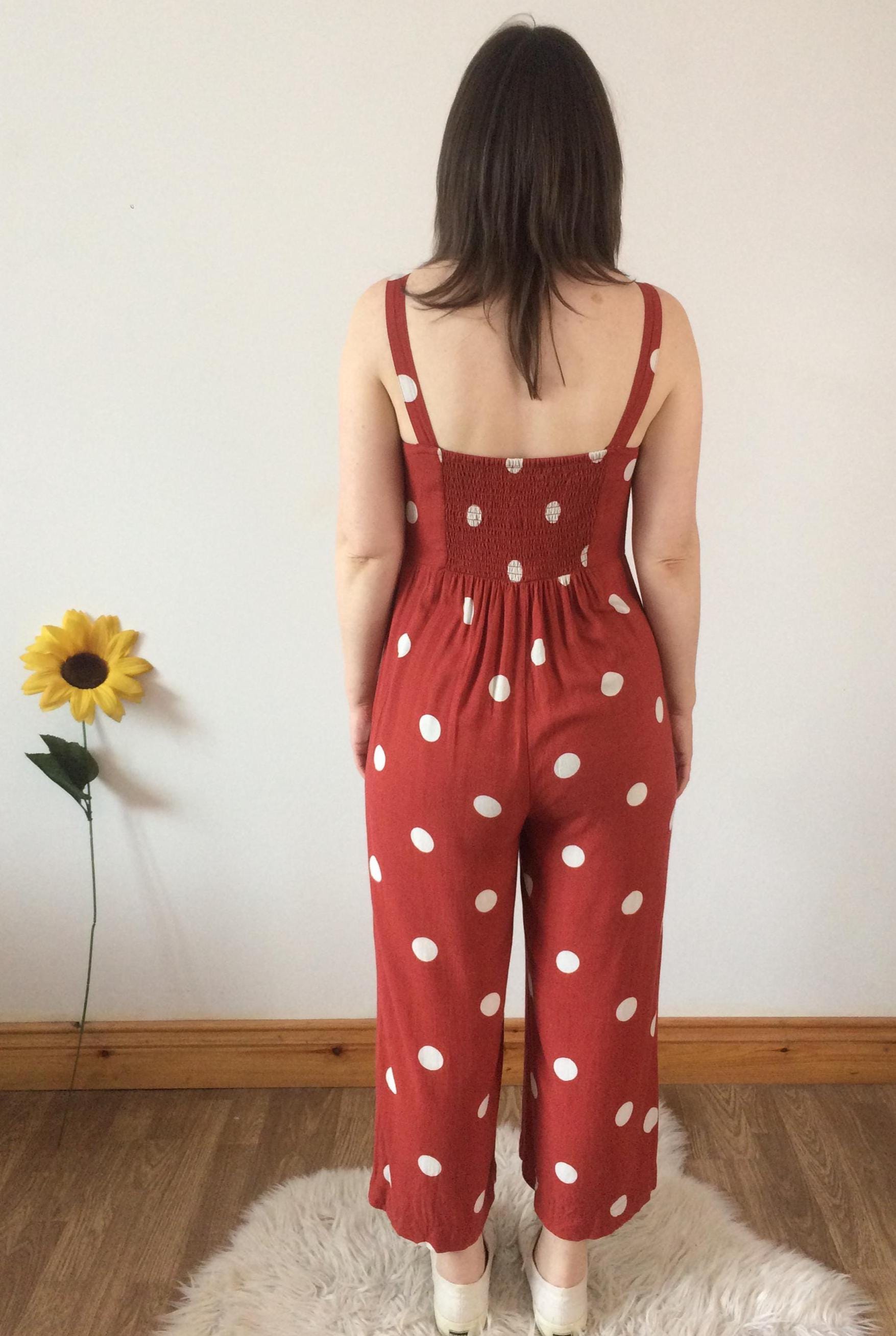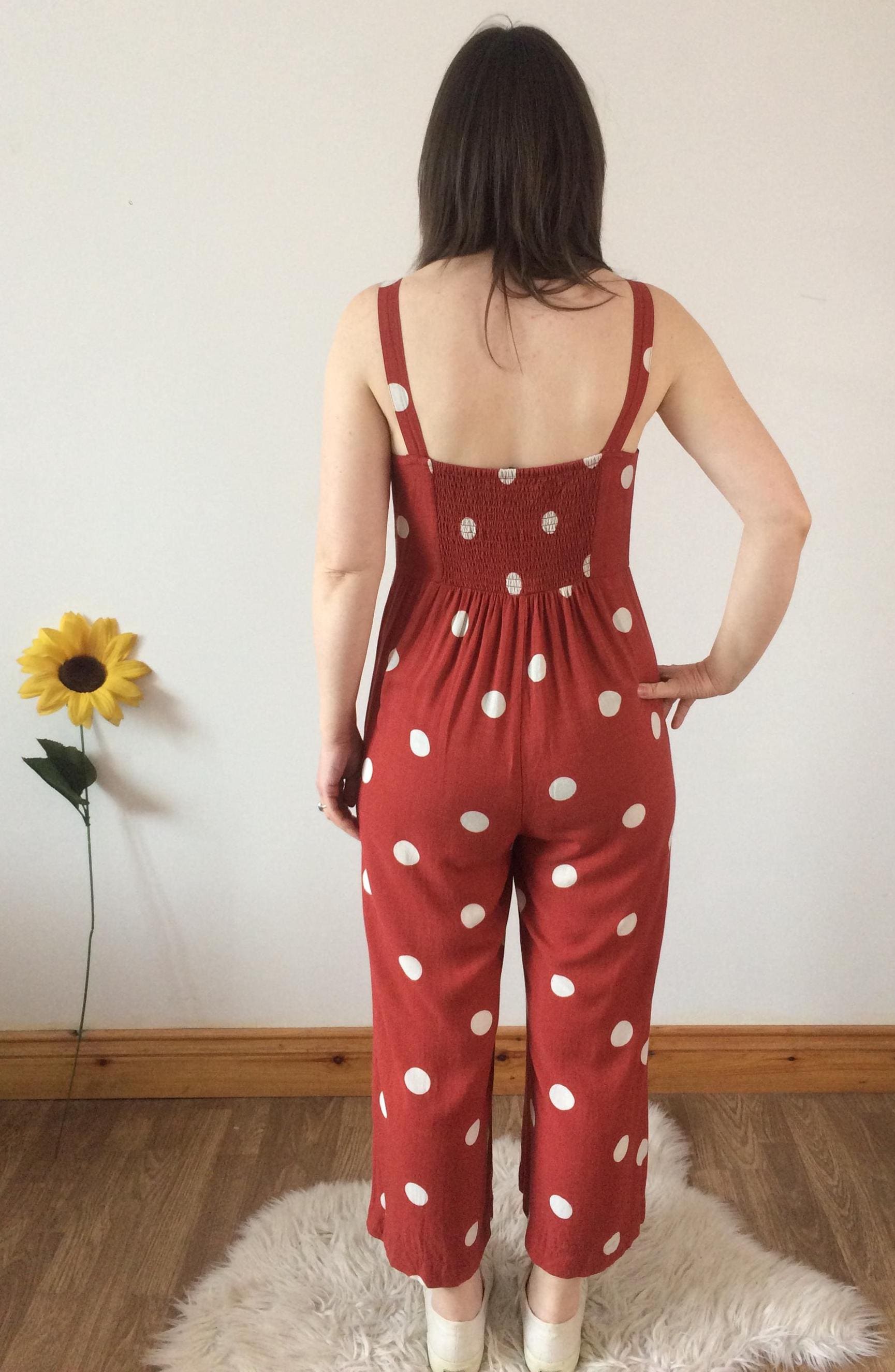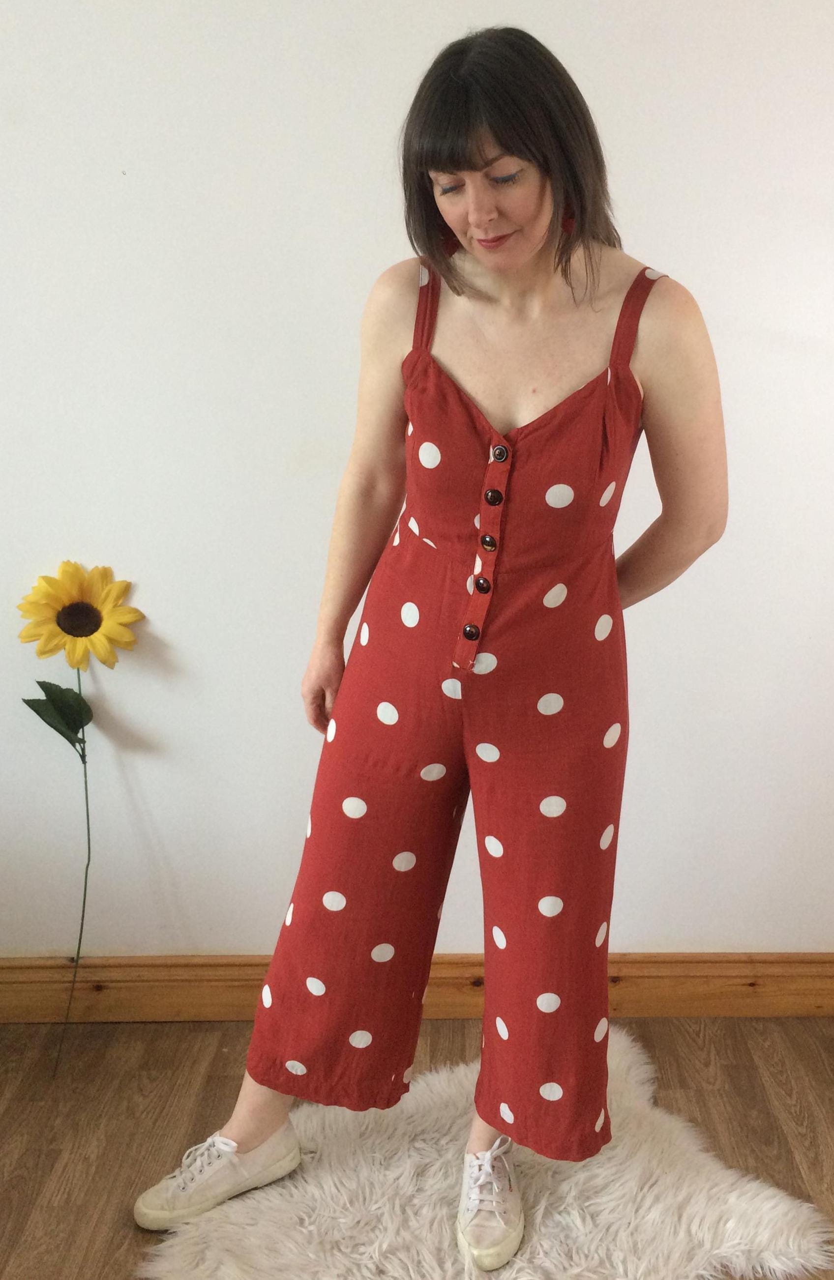 Vintage 90s Orange with White Polka Dot Jumpsuit. Size S. Model is a UK size 8 for reference. In great vintage condition. Should you require measurements, photos or product information please get in touch, I'd love to hear from you! Thank you for browsing :)
