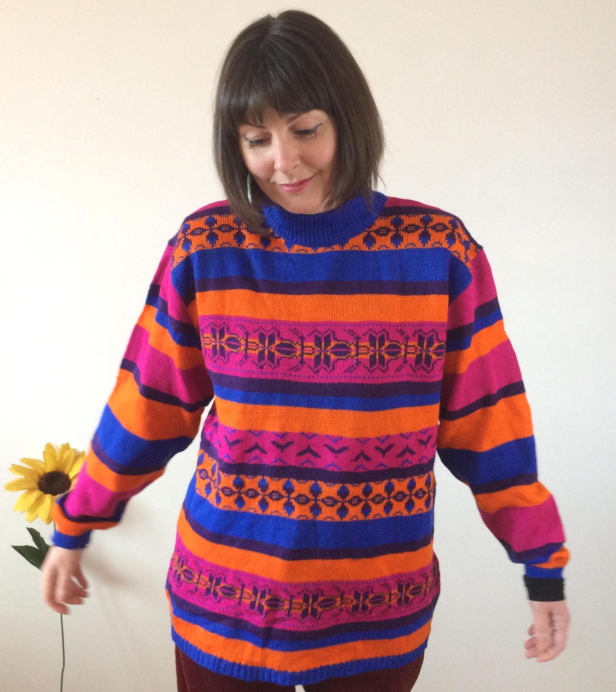Vintage 80s Pink Orange Black & Blue Jumper. Size M. Model is a UK size 8 for reference. In great vintage condition. Should you require measurements, photos or product information please get in touch, I'd love to hear from you! Thank you for browsing :) xx