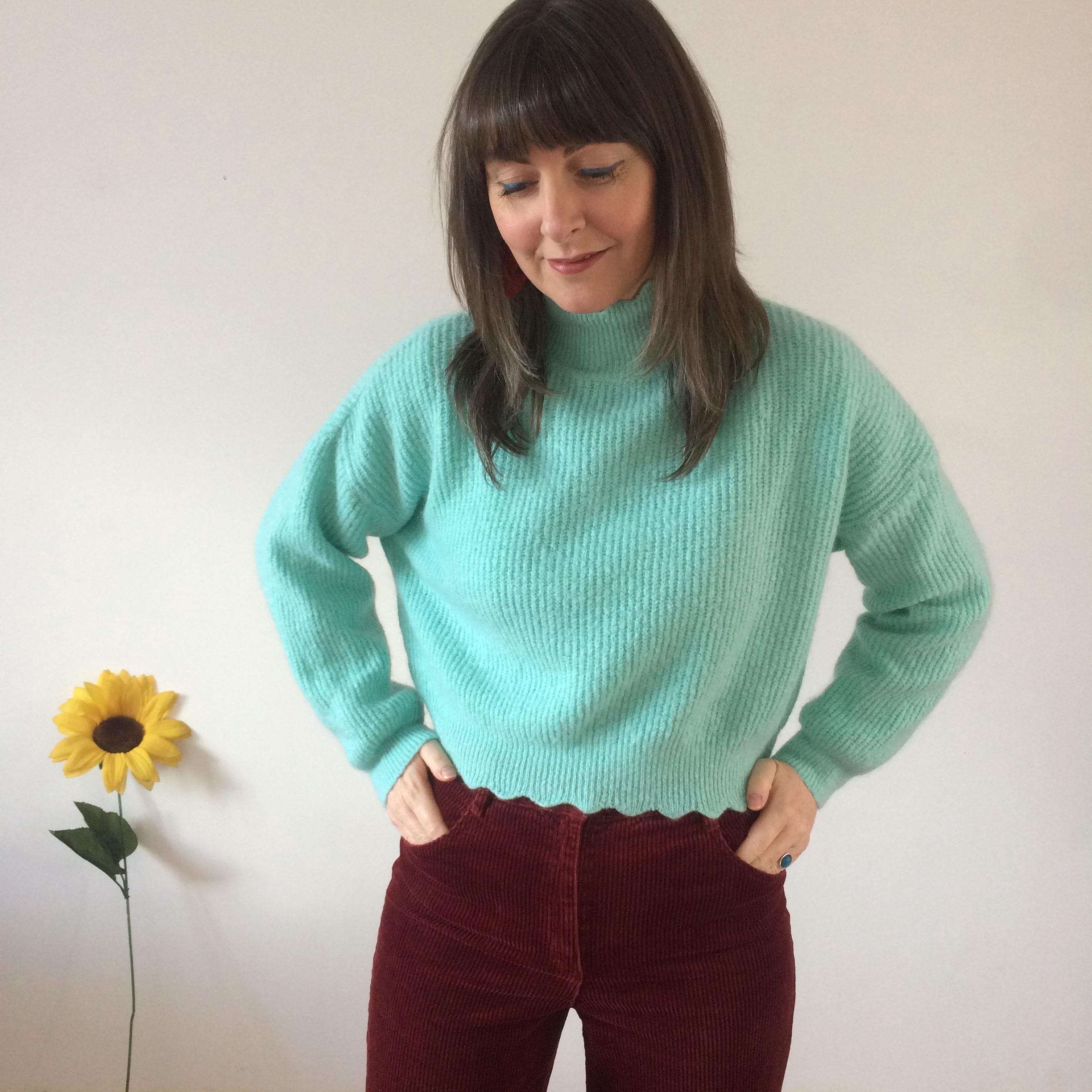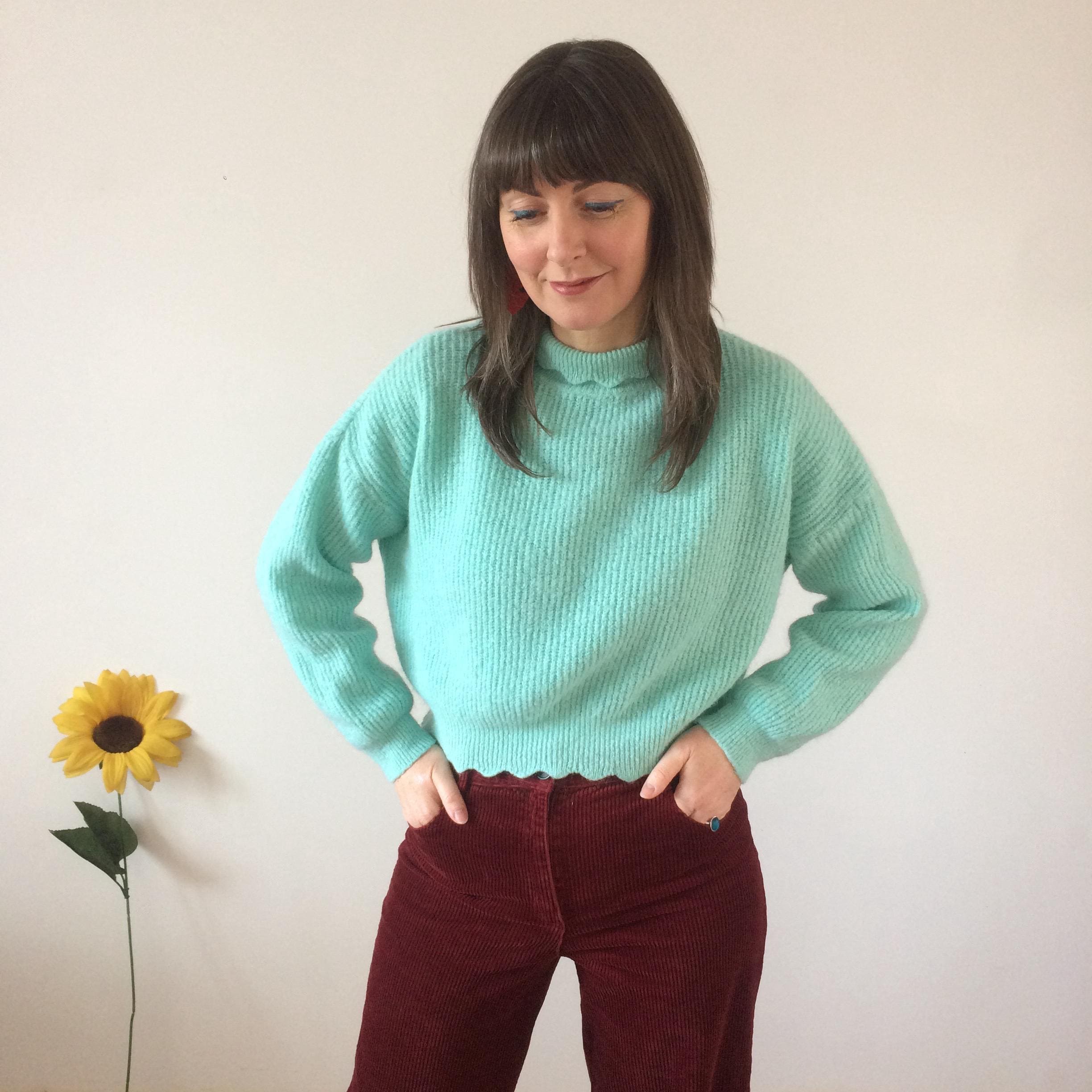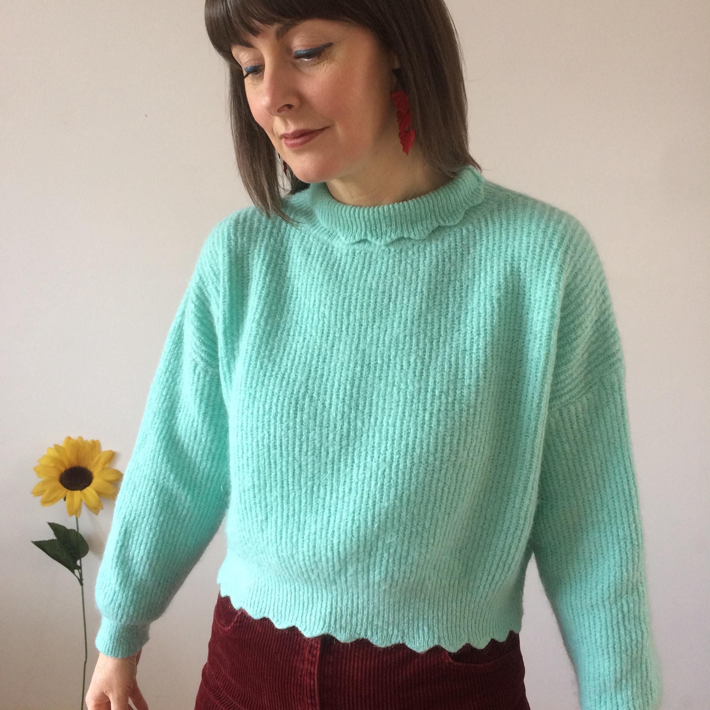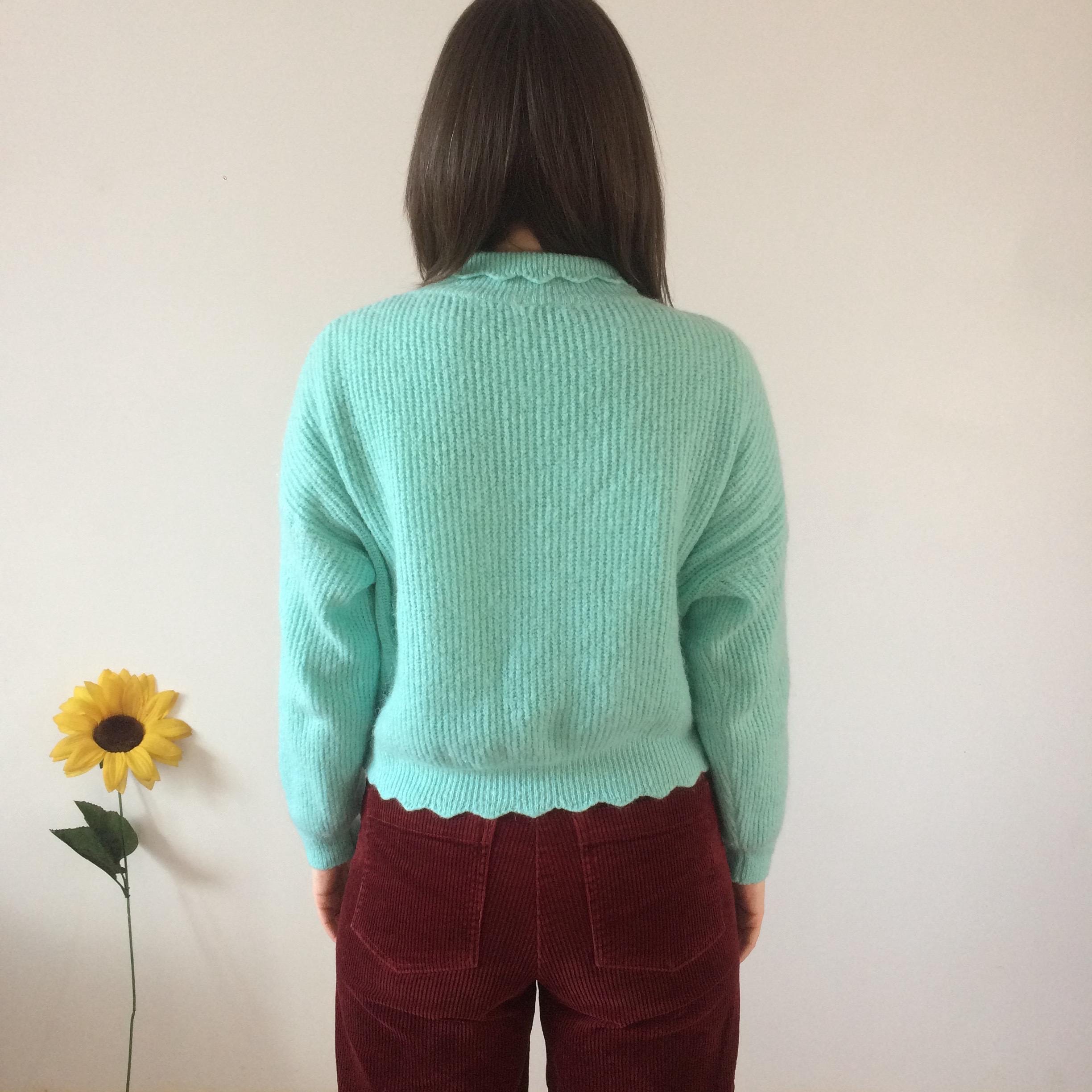 Cropped Aquamarine knit Jumper with Scalloped neckline and hem. Size S. Model is a UK size 8 for reference. In great vintage condition. Should you require measurements, photos or product information please get in touch, I'd love to hear from you! Thank you for browsing :)
